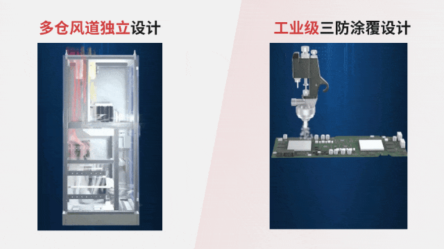 工业场景中的高温、粉尘、腐蚀性气体等,是电气设备的“天然杀手”。科华在散热上采用多仓风道独立设计,通过内部结构设计阻断粉尘进入关键器件区域,避免粉尘干扰和局部过热,显著降低故障风险。同时,器件表面采用三防漆涂覆设计,高于中度污染的工业环境防护要求,进一步增强粉尘、盐雾抵御能力。