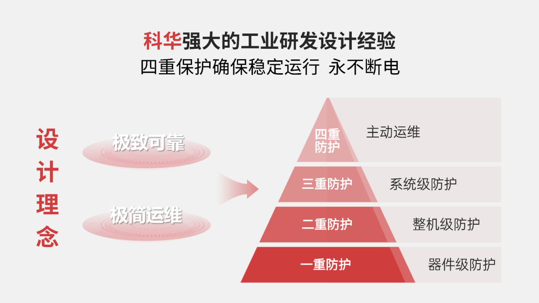 科华打造的“工业级产品设计理念”,是以“极致可靠、极简运维”为核心,依托“事前预警+事前预防”双重机制,通过模拟各类复杂工况下的潜在故障,反复推演与测试,形成从底层硬件到顶层管理的四重保护机制,确保产品在设计之初就具备应对各种严酷挑战的“硬核身体素质”。